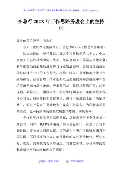 / 在总行202X年工作思路务虚会上的主持词