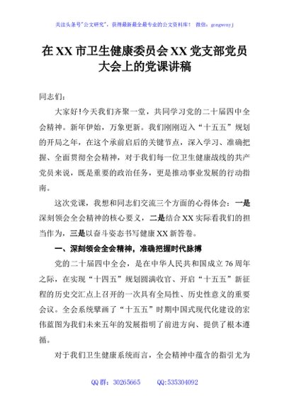 / 在XX市卫生健康委员会XX党支部党员大会上的党课讲稿
