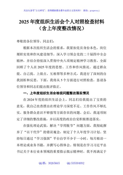 / 2025年度组织生活会个人对照检查材料(含上年度整改情况)