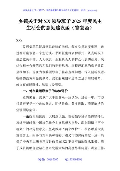 / 乡镇关于对XX领导班子2025年度民主生活会的意见建议函(答复函)