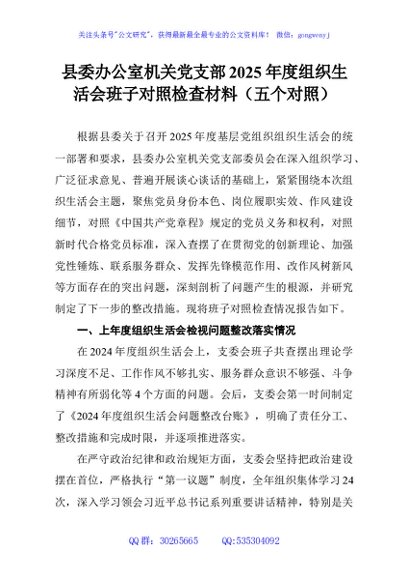 / 县委办公室机关党支部2025年度组织生活会班子对照检查材料(五个对照)