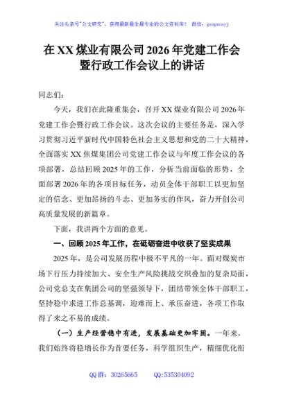/ 在XX煤业有限公司2026年党建工作会暨行政工作会议上的讲话