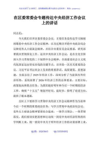/ 在区委常委会专题传达中央经济工作会议上的讲话