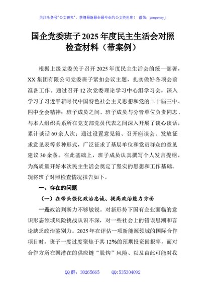 / 国企党委班子2025年度民主生活会对照检查材料(带案例)