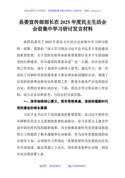 / 县委宣传部部长在2025年度民主生活会会前集中学习研讨发言材料