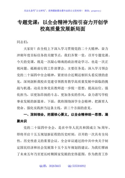 未生成预览图,长按二维码添加 专题党课:以全会精神为指引奋力开创学校高质量发展新局面 - 公文研究
