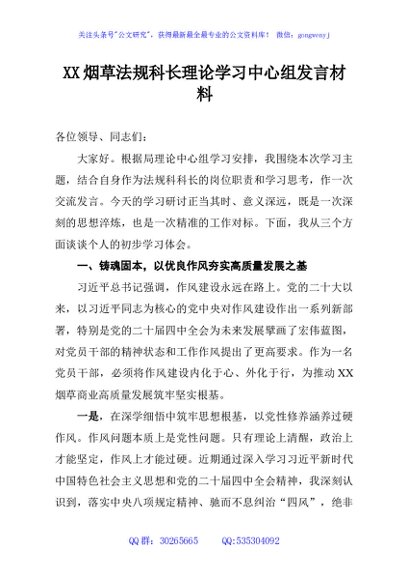 未生成预览图,长按二维码添加 XX烟草法规科长理论学习中心组发言材料 - 公文研究