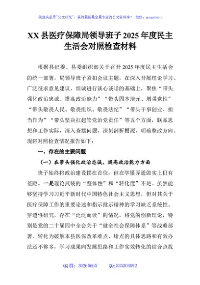 未生成预览图,长按二维码添加 XX县医疗保障局领导班子2025年度民主生活会对照检查材料 - 公文研究