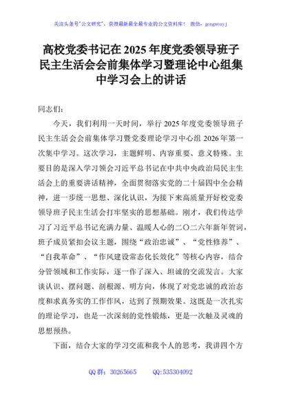 高校党委书记在2025年度党委领导班子民主生活会会前集体学习暨理论中心组集中学习会上的讲话 - 公文研究