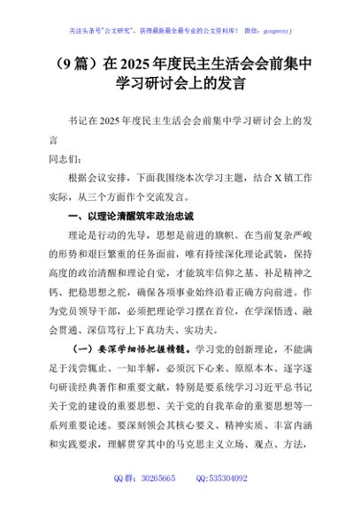 / (9篇)在2025年度民主生活会会前集中学习研讨会上的发言