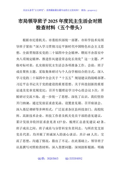 / 市局领导班子2025年度民主生活会对照检查材料(五个带头)