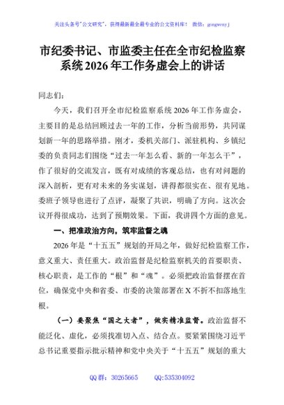 / 市纪委书记、市监委主任在全市纪检监察系统2026年工作务虚会上的讲话