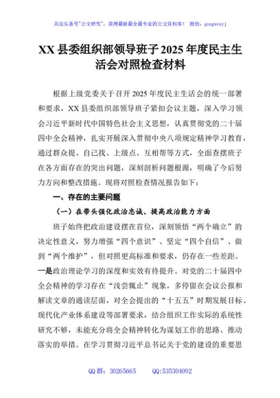 / XX县委组织部领导班子2025年度民主生活会对照检查材料