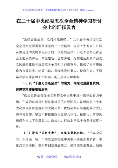 / 在二十届中央纪委五次全会精神学习研讨会上的汇报发言
