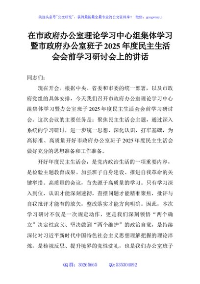 / 在市政府办公室理论学习中心组集体学习暨市政府办公室班子2025年度民主生活会会前学习研讨会上的讲话
