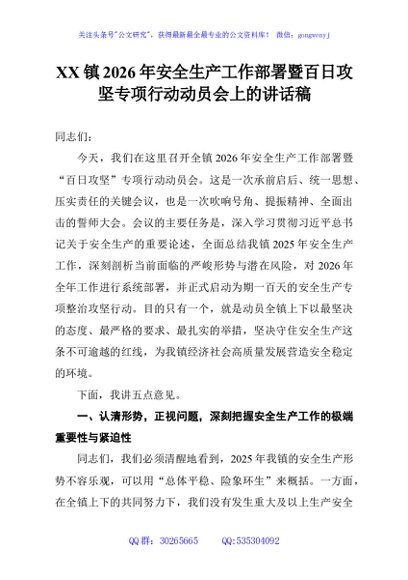 / XX镇2026年安全生产工作部署暨百日攻坚专项行动动员会上的讲话稿