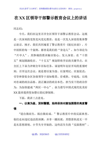 / 在XX区领导干部警示教育会议上的讲话