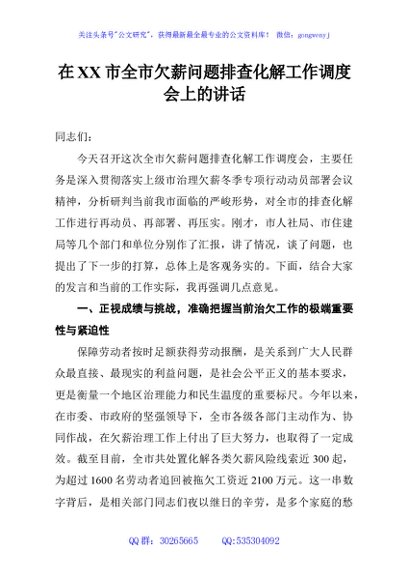 / 在XX市全市欠薪问题排查化解工作调度会上的讲话