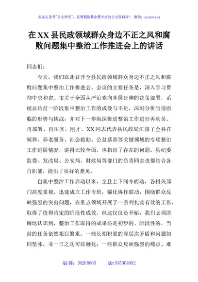 / 在XX县民政领域群众身边不正之风和腐败问题集中整治工作推进会上的讲话