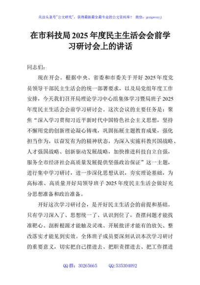 / 在市科技局2025年度民主生活会会前学习研讨会上的讲话