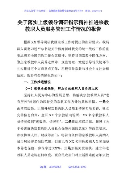 / 关于落实上级领导调研指示精神推进宗教教职人员服务管理工作情况的报告