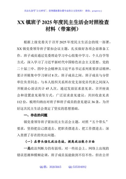 / XX镇班子2025年度民主生活会对照检查材料(带案例)