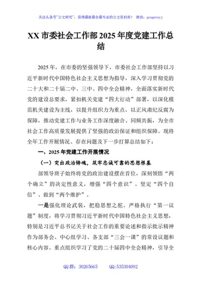 / XX市委社会工作部2025年度党建工作总结