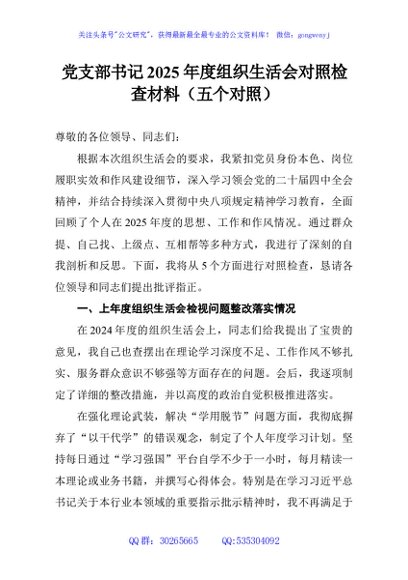 / 党支部书记2025年度组织生活会对照检查材料(五个对照)