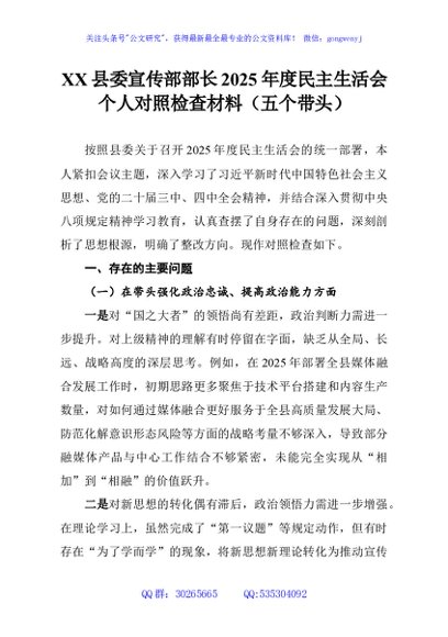 / XX县委宣传部部长2025年度民主生活会个人对照检查材料(五个带头)