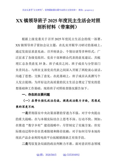 / XX镇领导班子2025年度民主生活会对照剖析材料(带案例)