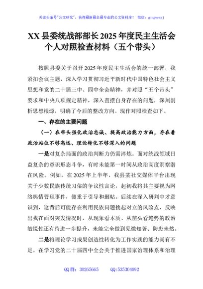 / XX县委统战部部长2025年度民主生活会个人对照检查材料(五个带头)