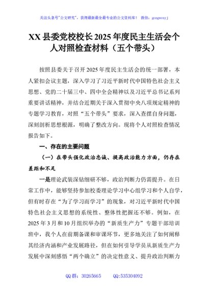 / XX县委党校校长2025年度民主生活会个人对照检查材料(五个带头)