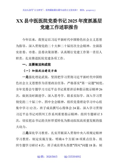 / XX县中医医院党委书记2025年度抓基层党建工作述职报告