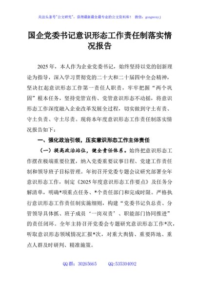 / 国企党委书记意识形态工作责任制落实情况报告