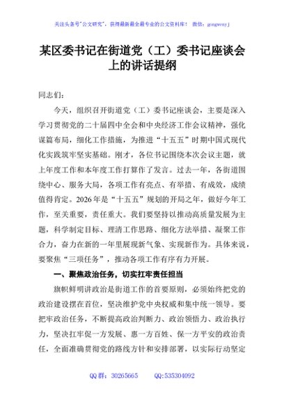 / 某区委书记在街道党(工)委书记座谈会上的讲话提纲