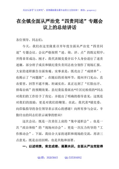 / 在全镇全面从严治党“四责同述”专题会议上的总结讲话