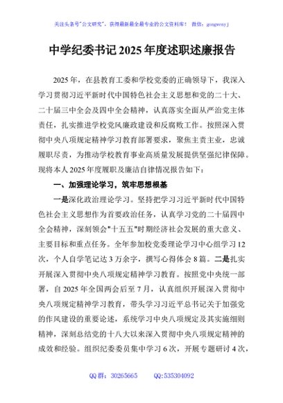 / 中学纪委书记2025年度述职述廉报告