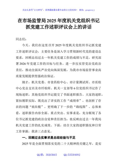 / 在市场监管局2025年度机关党组织书记抓党建工作述职评议会上的讲话