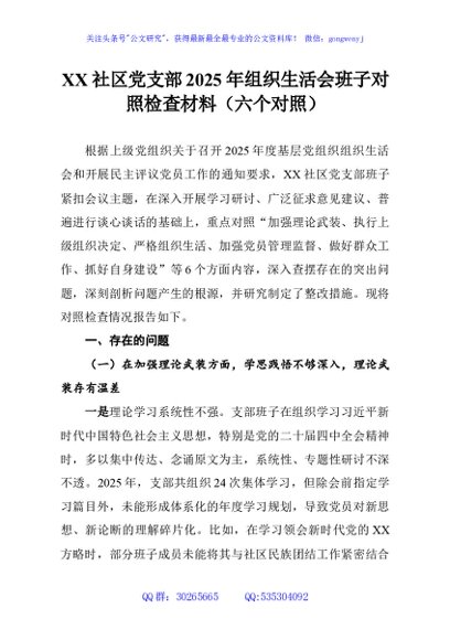 / XX社区党支部2025年组织生活会班子对照检查材料(六个对照)