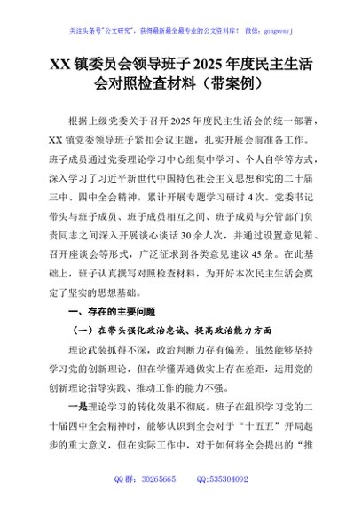 / XX镇委员会领导班子2025年度民主生活会对照检查材料(带案例)