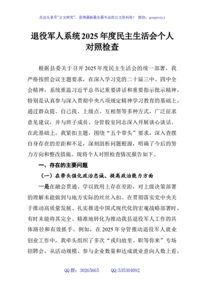 / 退役军人系统2025年度民主生活会个人对照检查