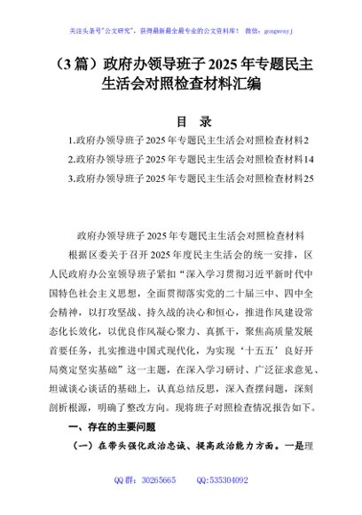 (3篇)政府办领导班子2025年专题民主生活会对照检查材料汇编