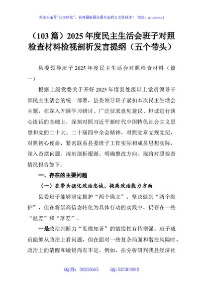 / (103篇)2025年度民主生活会班子对照检查材料检视剖析发言提纲(五个带头)