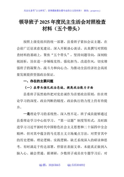 / 领导班子2025年度民主生活会对照检查材料(五个带头)