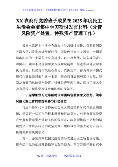 / XX农商行党委班子成员在2025年度民主生活会会前集中学习研讨发言材料(分管风险资产处置、特殊资产管理工作)