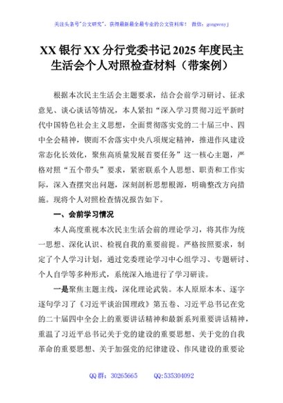 XX银行XX分行党委书记2025年度民主生活会个人对照检查材料(带案例) - 公文研究