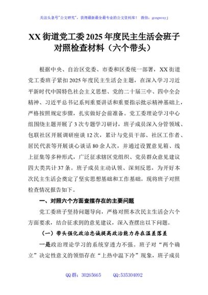 / XX街道党工委2025年度民主生活会班子对照检查材料(六个带头)