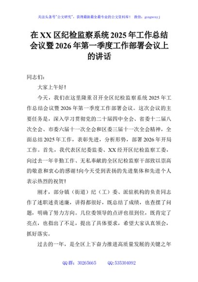 / 在XX区纪检监察系统2025年工作总结会议暨2026年第一季度工作部署会议上的讲话