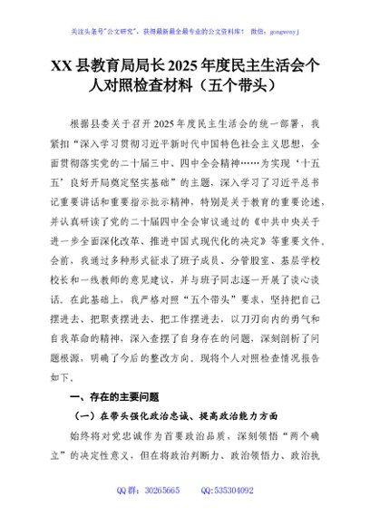 / XX县教育局局长2025年度民主生活会个人对照检查材料(五个带头)