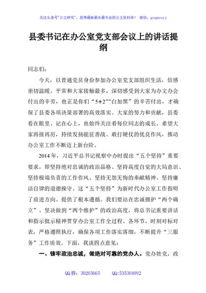 / 县委书记在办公室党支部会议上的讲话提纲